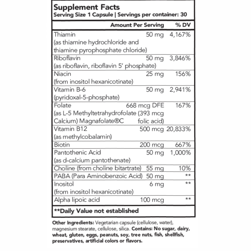 Once-daily methylated B-Complex formulation for high potency and maximum bioactivity, with supporting PABA and ALA, in a vegetarian capsule.