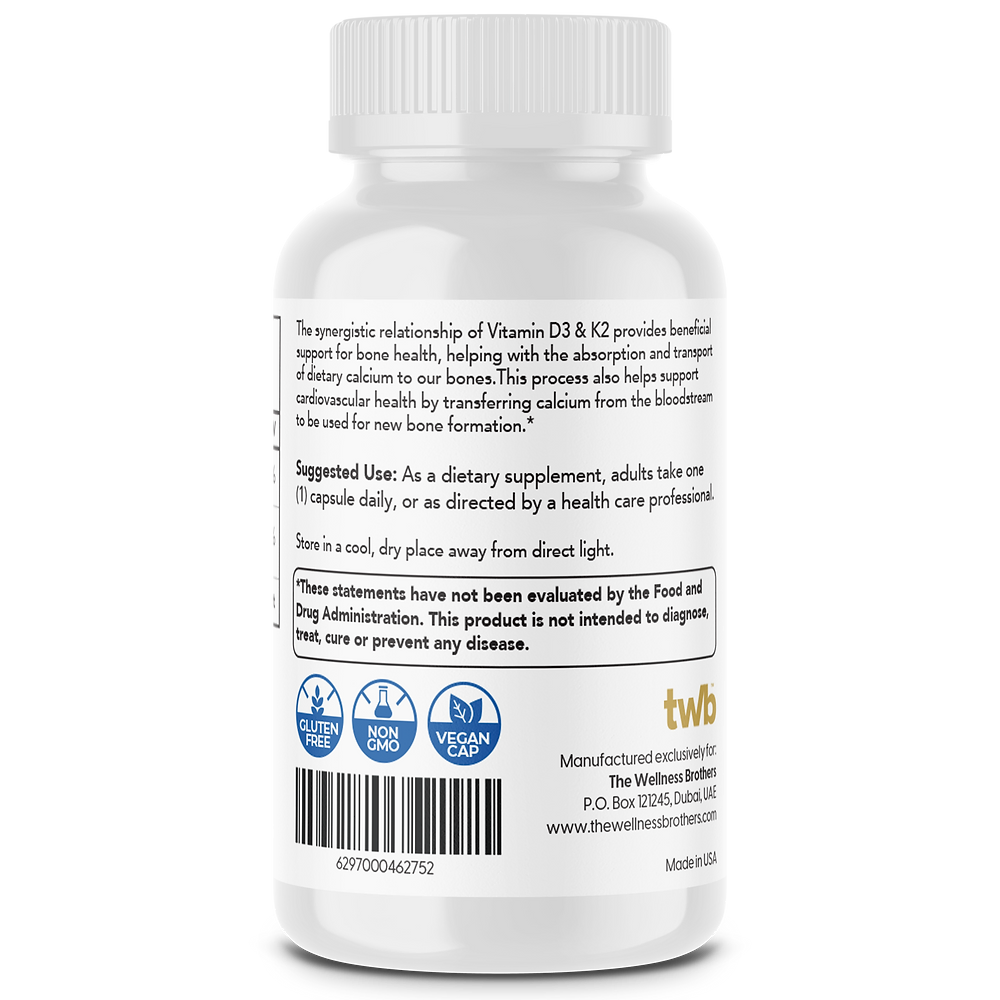 Vitamins D3 and K2 are both fat-soluble vitamins when combined, the two vitamins focus mainly on helping to improve both bone health and cardiovascular health. The synergistic relationship helps to properly utilize calcium within the body, from the absorption to the binding of calcium to bones.