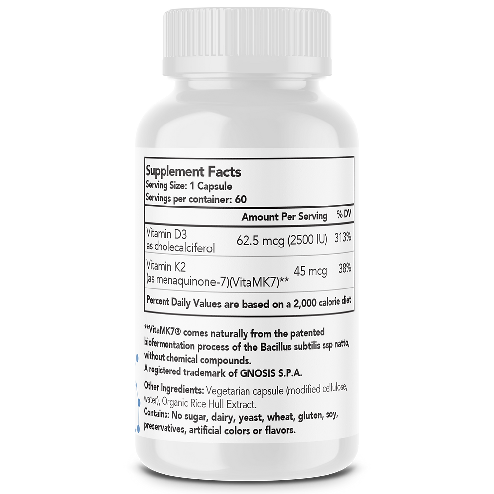 Vitamin K2 is essential for binding newly absorbed calcium to the mineral matrix in bone. Studies have shown that vitamin K2 is the more bioavailable form of the nutrient and influences bone building more powerfully than K1. The mechanism of action of Vitamins D3 and K2 not only enhances bone strength and structure but also helps to improve cardiovascular health by removing excess calcium from the bloodstream, limiting the chance of arteriosclerosis.